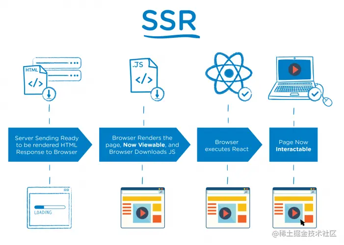 其实,针对SSR还有其他的技术细节需要考虑,例如,何为同构、数据脱水、渲染注入(hydrate)等。关于SSR,我们后期会有专门的文章来解释。