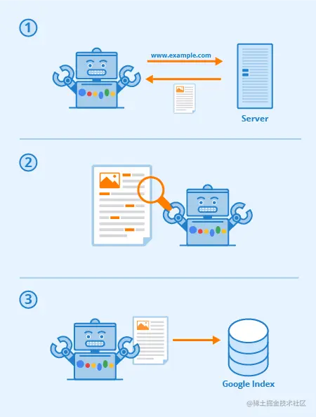 传统网页开发模式,网站内容(html)都是采用服务端渲染(SSR)的方式产出的。这样做,方便爬虫能够定位到网站内容。这个过程就是:爬虫发现你的网站内容,并且将其展现在大众面前。