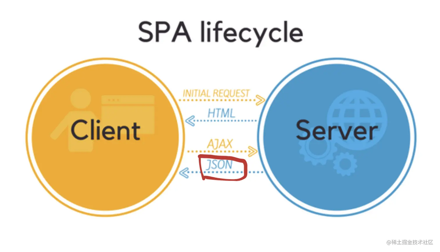 当页面中的部分内容发生了变更,浏览器只需要向服务端发送用于获取该与该变更信息相关的AJAX。服务端在接收到指定的请求后,经过拼装处理,将浏览器想要的结果(通常是JSON的数据格式)返回。
