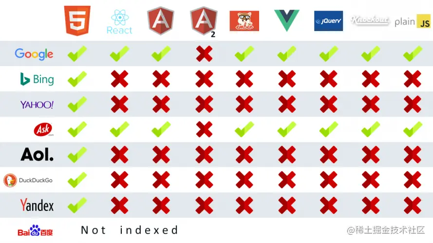 下图展示了,各个浏览器对各种JS框架的爬虫支持程度