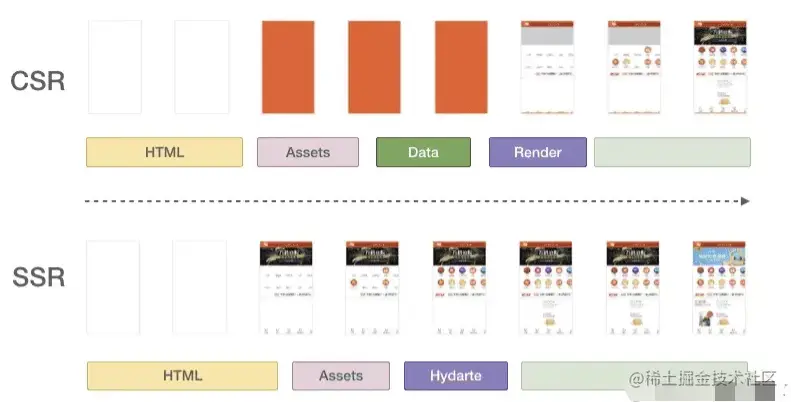 可以通过一个图,对比CSR和SSR渲染同一页面所用的时间。 很明显,SSR渲染,页面的有效内容较早出现。