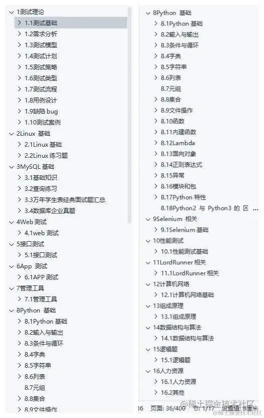 主要涵盖以下内容,贪多嚼不烂:软件测试、MySQL、liunx、web测试,接口测试,APP测试,管理工具,Python基础,selenium相关,性能测试,lordrunner相关,计算机网络,组成原理,数据结构与算法,逻辑题,人力资源,最新互联网大厂100道高级面试题17个模块等。有与文章的内容可能过长,不能在这里一一给大家展示所有的面试题目以及答案,需要的朋友可以点击链接领取《软件测试全套基础/进阶/转行资料》