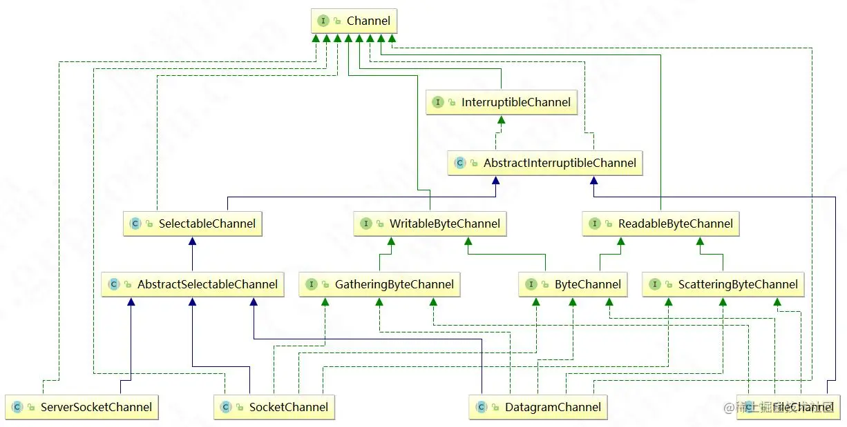在NIO 中提供了多种通道对象,而所有的通道对象都实现了Channel 接口,它们之间的继承关系如下: