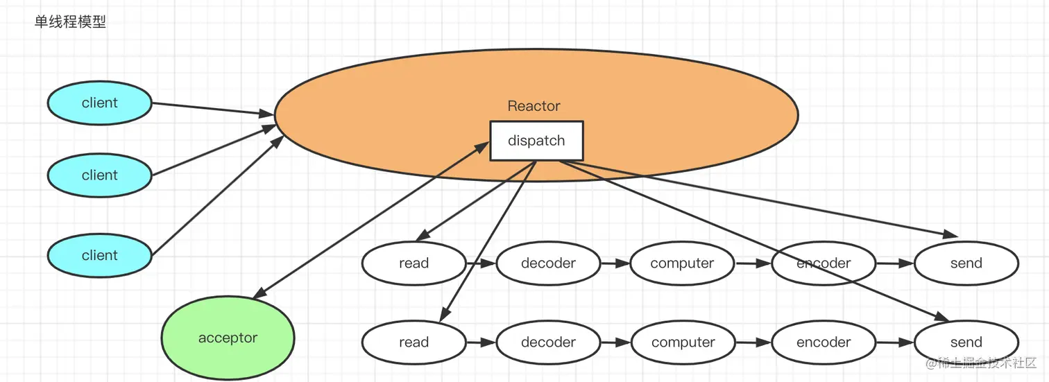 下面给我最简单的单线程 Reactor 模式的NIO 处理流程图: