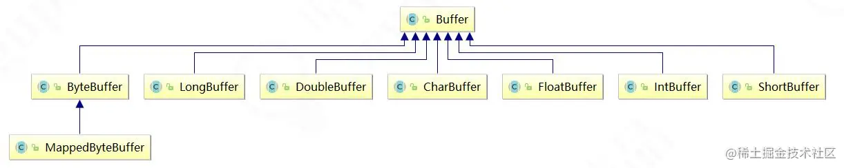 所有的缓冲区类型都继承于抽象类Buffer, 最常用的就是ByteBuffer ; 当然 java 基本数据类型都有对应的Buffer ;