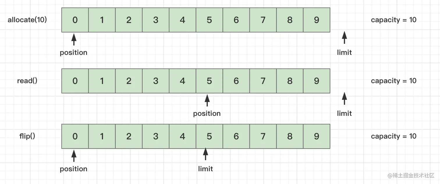 位置关系: 0 <= position <= limit <= capacity