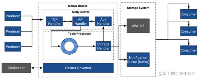 调控器(Governor)是 MemQ 集群的领导者,它负责自动再平衡和主题处理器的分配。集群中的任何代理都可以被选为调控器,它通过 Zookeeper 与代理进行通信,Zookeeper 也是在调控器的选举中使用的。