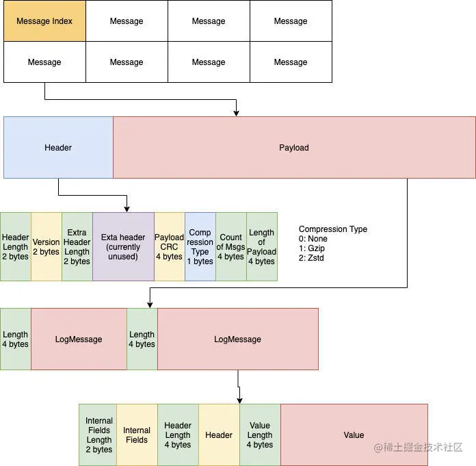 MemQ 的最低传输单位被称为 LogMessage。这类似于 Pulsar Message 或 Kafka ProducerRecord。