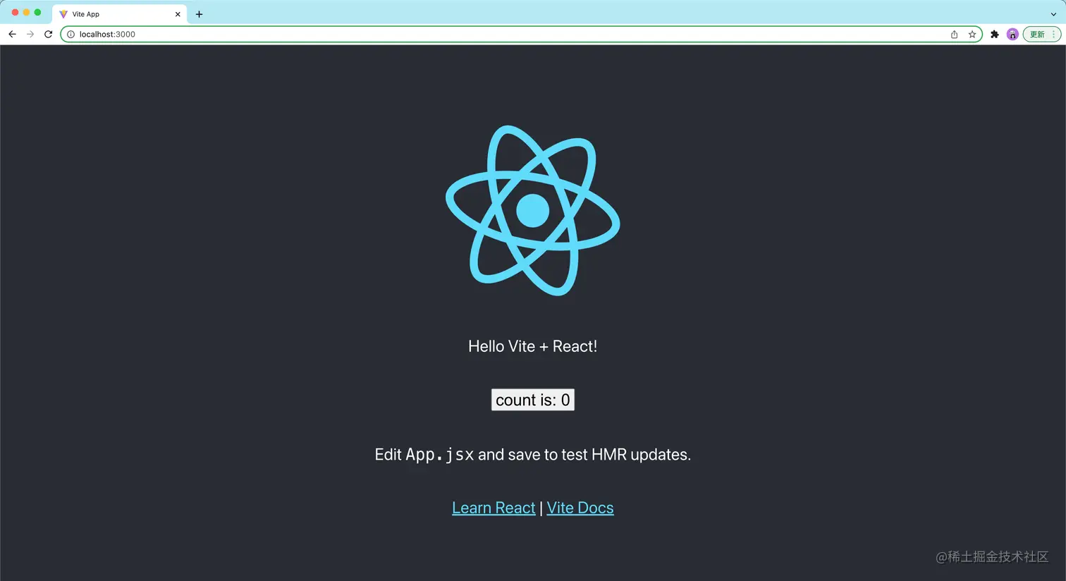 可以看到 项目成功启动 耗时362ms,这也是vite很受前端欢迎的原因之一,启动特别快。然后复制链接在浏览器打开,如下,项目成功启动了。