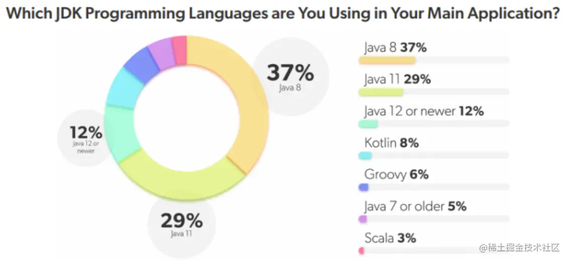 调查结果指出,大多数 Java 开发人员正计划迁移到该语言的最新长期支持 (LTS) 版本;其中,62% 的开发人员计划在未来 12 个月内进行切换。 目前,Java 8 仍是生产中使用最多的版本,占 37%;其次是 Java 11,占 29%;这两个都是 LTS 版本。只有 12% 的开发人员使用 Java 12 或更高版本。