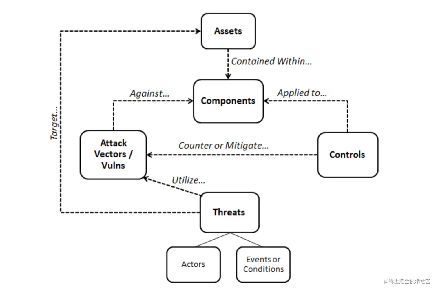 在这个关系中,威胁源并不/很少直接访问目标资产,获取目标资产既要和系统中的其他元素交互也要在适当的时候避开它们。控制并非直接作用于资产,相反,控制措施必须提供安全功直作用于识别的威胁、攻击向量及漏洞——能提供对含有资产的组件访问能力。