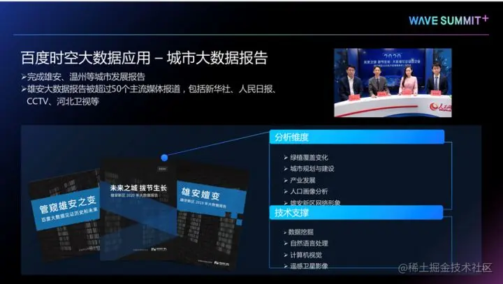 PaddleSpatial的能力还可以协助我们进行城市发展趋势的研判和分析,为城市管理者制定决策,提供数据和技术上的支持。近期我们支持了雄安、温州等城市的城市大数据报告。特别是雄安的大数据报告,从2018年开始做,已经连续做了第4期,产生了广泛的媒体影响力。