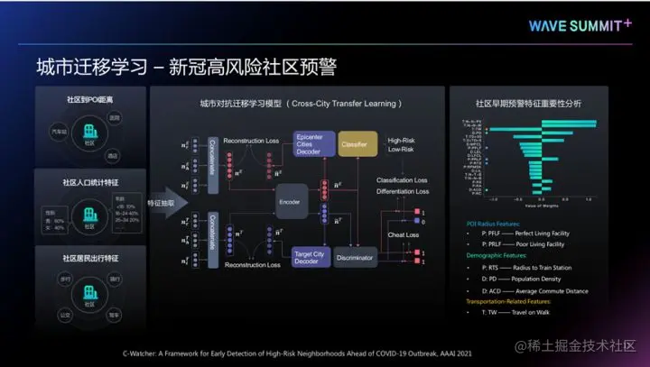 我们还会进一步研究城市之间的关系,并学习城市的已知规律,将它应用到其他的城市上。在2020年疫情期间,我们实验室和地图合作完成了一个新冠肺炎感染高风险小区的识别项目。该项目结合多模态学习和城市区域迁移学习技术,设计了城市新冠肺炎感染高风险小区的识别算法。去年新冠疫情刚爆发的时候,只有武汉开始大规模流行。通过看武汉发生大规模疫情爆发的小区特点是什么样的,来抽取出规律,进而指导其他城市。我们研发的模型可以定位新冠疫情高风险小区的成因,提示政府对不同区域采取针对性优化措施,助力政府提高疫情管控能力。