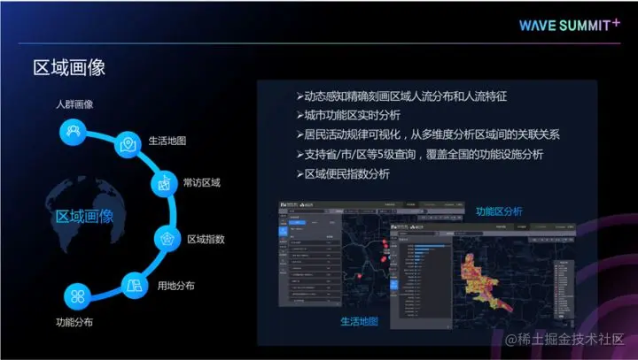 我们首先介绍的是区域画像。区域画像包括人群画像、生活地图、常访区域、区域指数、用地分布、功能分布等特色功能。区域画像具有更细粒度的分析力和辨识能力,可以动态感知区域间人流分布和人流特征,并进行城市功能区的实时分析。区域画像的覆盖范围非常精细,可以支持省到街道的5级空间维度的缩放,相关数据可以支持覆盖全国的用户特征和功能设施分析。