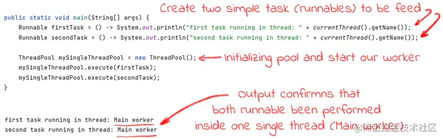 执行之后,我们可以看到不同的runnables在一个主工作线程中被执行。这证明我们的线程池正在如我们所期望的那样工作。