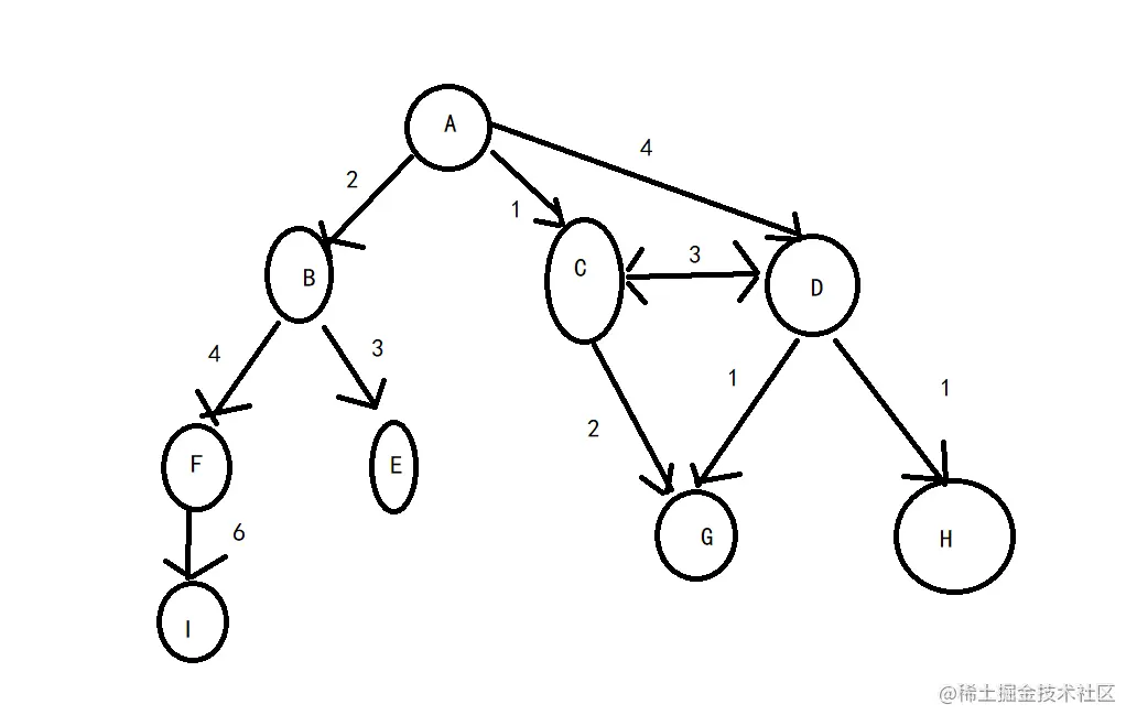 图还可以是未加权的,或者是加权的。如下图所示,加权图的边被赋予了权值:
