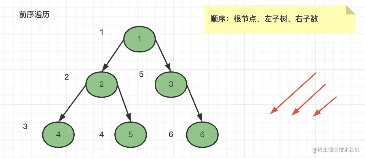 注:深度优先遍历的条件是,以根节点为基准的,且先左后右,不这样的话,遍历的种类有 3! = 6种了;