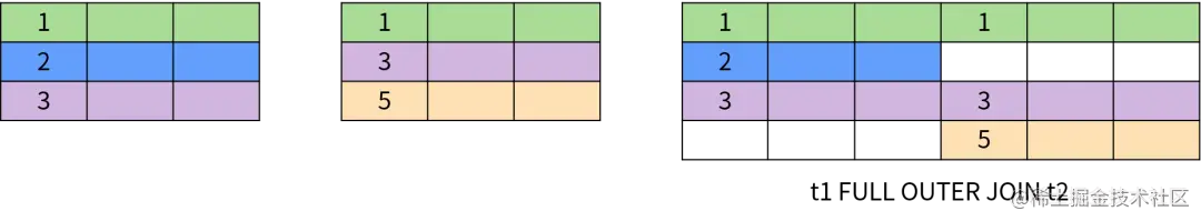 全外连接(Full Outer Join)等价于左外连接加上右外连接,同时返回左表和右表中所有的数据;对于两个表中不满足连接条件的数据返回空值。全外连接的原理如下图所示:
