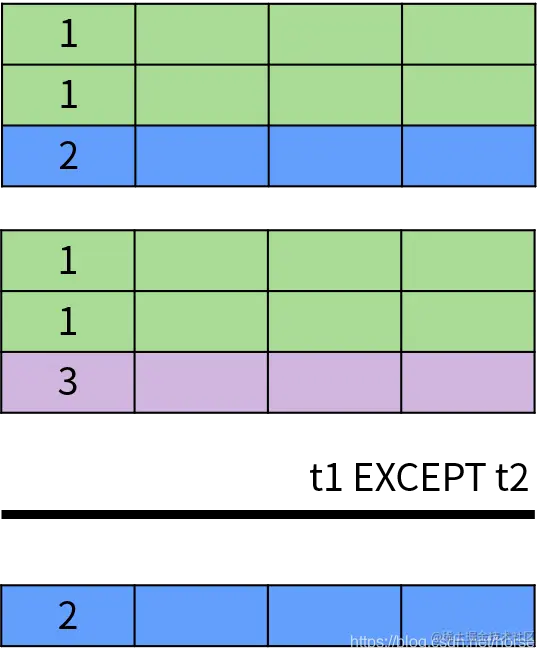 EXCEPT 或者 MINUS 操作符用于返回两个集合的差集,即出现在第一个查询结果中,但不在第二个查询结果中的记录,并且排除了结果中的重复数据。EXCEPT 运算符的示意图如下: