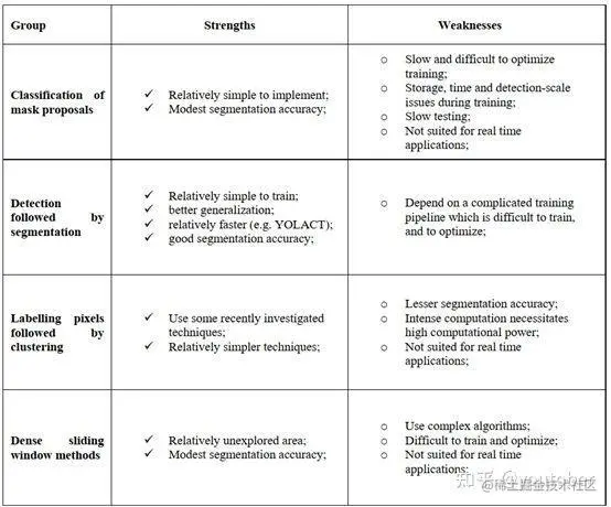 主要有四种:掩模建议分类法、先检测再分割法、标记像素后聚类法和密集滑动窗口法