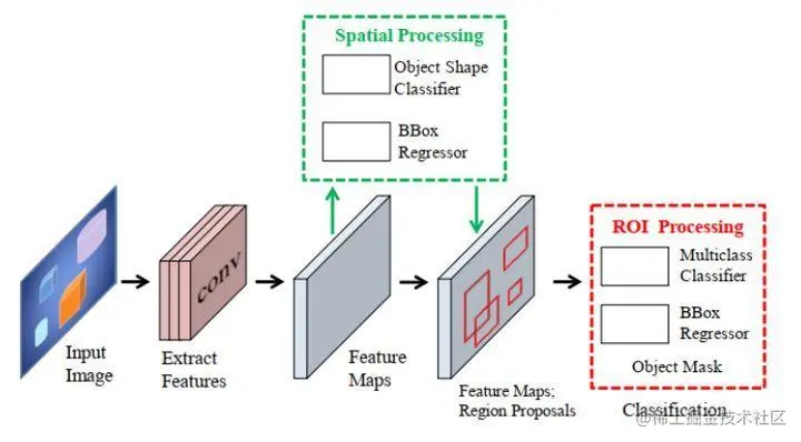 Fast RCNN解决了RCNN的一些问题,从而提高了目标检测能力。Fast RCNN使用检测器的端到端训练。它通过同时学习softmax分类器和类特定的BBox回归简化了训练过程,而不是像RCNN那样单独训练模型的各个组件。快速RCNN共享区域方案的卷积计算,然后在最后一个卷积层和第一个全连接层之间添加一个ROI池化层,提取每个区域方案的特征。聚类利用特征层扭曲的概念来实现图像层扭曲。将ROI池化层特征分解为一组全连通层,最后分解为目标类别预测软最大概率和类别建议精细化偏移量两层。与RCNN相比,Fast RCNN在很大程度上提高了效率,训练速度提高了3倍,测试速度提高了10倍。
