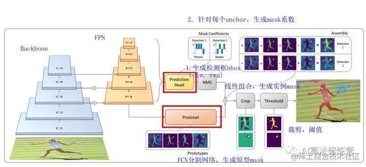 Backbone:Resnet 101+FPN,与RetinaNet相同;Protonet:接在FPN输出的后面,是一个FCN网络,预测得到针对原图的原型mask;Prediction Head:相比RetinaNet的Head,多了一个Mask Cofficient分支,预测Mask系数,因此输出是4*c+k。