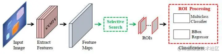 RCNN集成了AlexNet和使用选择性搜索技术的区域方案。RCNN模型的训练包括以下步骤。第一步涉及计算使用选择性搜索获得的类不可知区域建议。下一步是CNN模型微调,包括使用区域建议微调预先训练的CNN模型,如AlexNet。接下来,利用CNN提取的特征来训练一组类特异性支持向量机(SVM)分类器,该分类器取代了通过微调学习的softmax分类器。然后使用CNN获得的特征对每个对象类进行类特异性边界盒回归训练。
