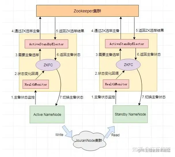接收ZKFC的选举请求,通过Zookeeper自动完成主备选举,选举完成后回调ZKFC的主备切换方法对NameNode进行Active和Standby状态的切换。