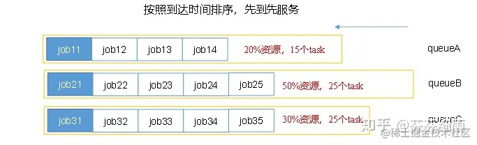 以队列为单位划分资源,每个队列可设定一定比例的资源最低保证和使用上限,同时,每个用户也可设定一定的资源使用上限以防止资源滥用。而当一个队列的资源有剩余时,可暂时将剩余资源共享给其他队列。