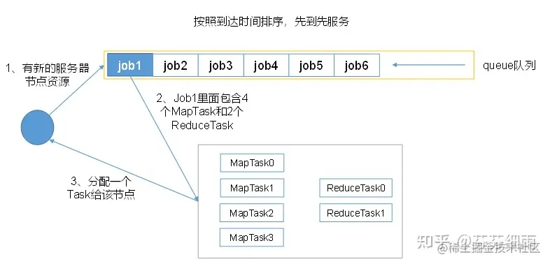 把应用按提交的顺序排成一个队列,这是一个先进先出队列,在进行资源分配的时候,先给队列中最头上的应用进行分配资源,待最头上的应用需求满足后再给下一个分配。