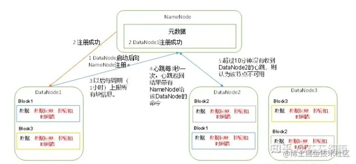 (3)心跳是每3秒一次,心跳返回结果带有NameNode给该DataNode的命令如复制块数据到另一台机器,或删除某个数据块。如果超过10分钟没有收到某个DataNode的心跳,则认为该节点不可用。