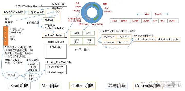 (1)Read阶段:MapTask通过用户编写的RecordReader,从输入InputSplit中解析出一个个key/value。\