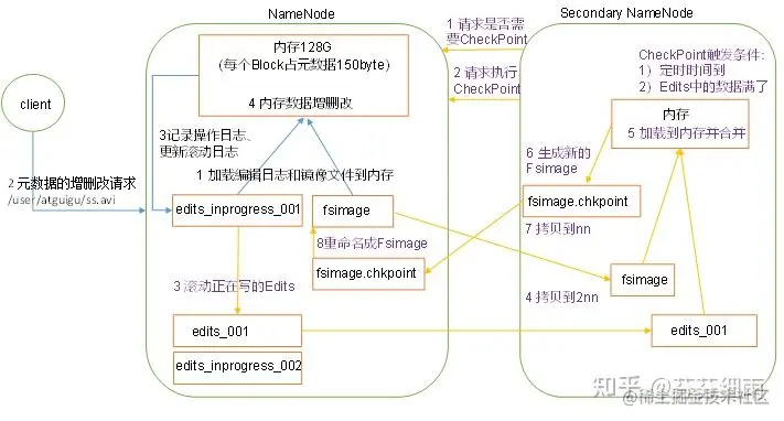 但是,如果长时间添加数据到Edits中,会导致该文件数据过大,效率降低,而且一旦断电,恢复元数据需要的时间过长。因此,需要定期进行FsImage和Edits的合并,如果这个操作由NameNode节点完成,又会效率过低。因此,引入一个新的节点SecondaryNamenode,专门用于FsImage和Edits的合并。