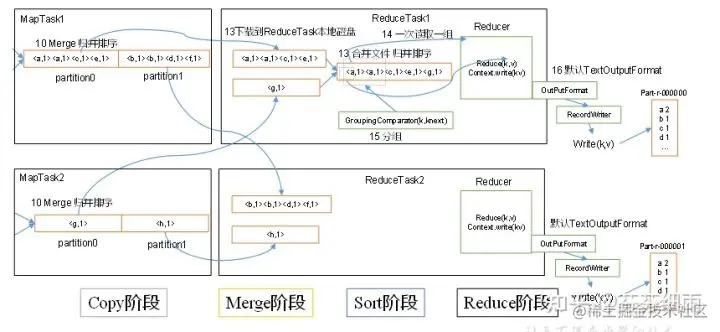 (2)Merge阶段:在远程拷贝数据的同时,ReduceTask启动了两个后台线程对内存和磁盘上的文件进行合并,以防止内存使用过多或磁盘上文件过多。