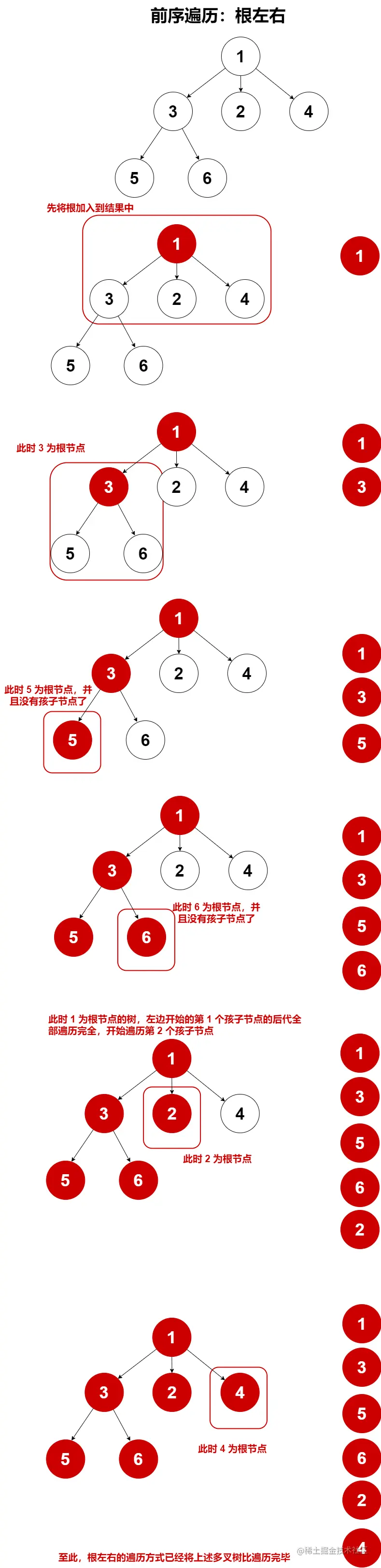 根据图中的推理过程,我们知道,前序遍历,我们可以按照根左右的遍历顺序来遍历一棵二叉树或者多叉树,思想是一样的