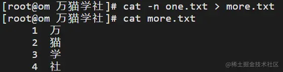 - 将one.txt的文件内容加上行号后输入到more.txt文件,再查看文件more.txt内容。