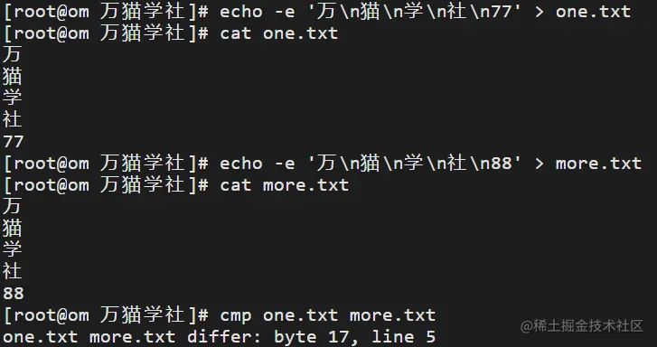 cmp命令用于比较两个文件是否有差异。当相互比较的两个文件完全一样时,该指令不会显示任何信息。否则会标示出第一个不同之处的字符和列数编号。当不指定任何文件名称,或文件名为"-",则cmp指令会从标准输入设备读取数据。