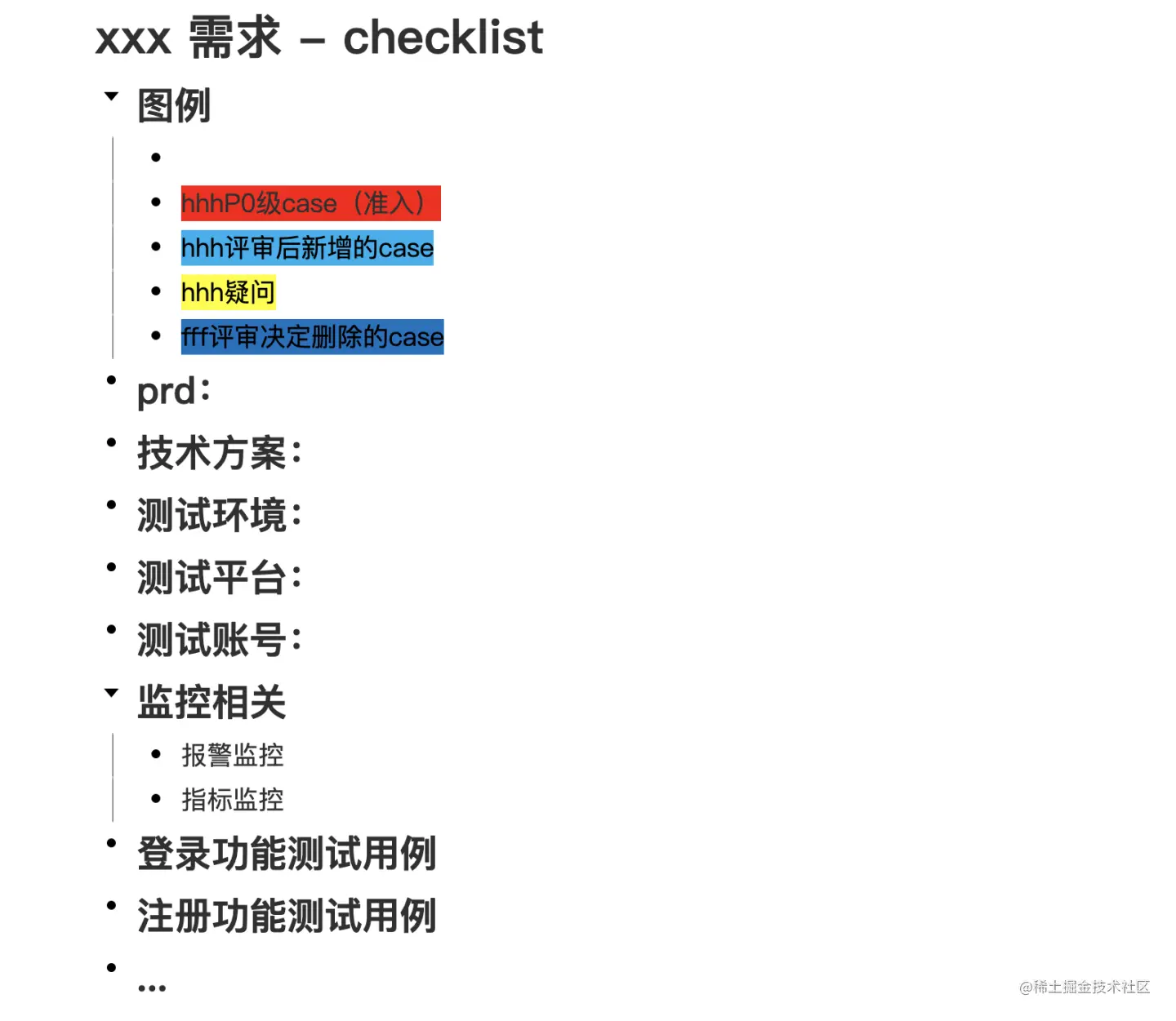 checklist 最重要的当然是测试用例,除此之外,附上相关依赖文件和测试数据,包括:prd,技术文档,测试账号,测试数据,测试平台,测试环境,图例(用红色背景标记出 P0 的冒烟 case,蓝绿色标记 checklist 评审时新增的 case ,疑问用黄色背景标注,深蓝色标记checklist 评审后决定删除的 case )等等。