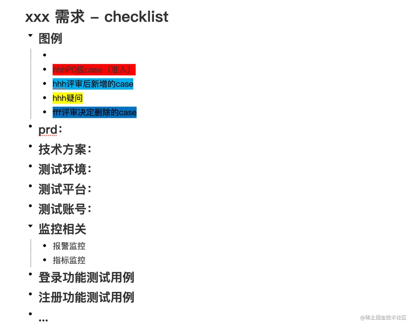 checklist 文档格式推荐使用思维导图。比如 MindMaster 和 processon。我喜欢用这些平台或者软件的思维导图大纲模式来编写 checklist。