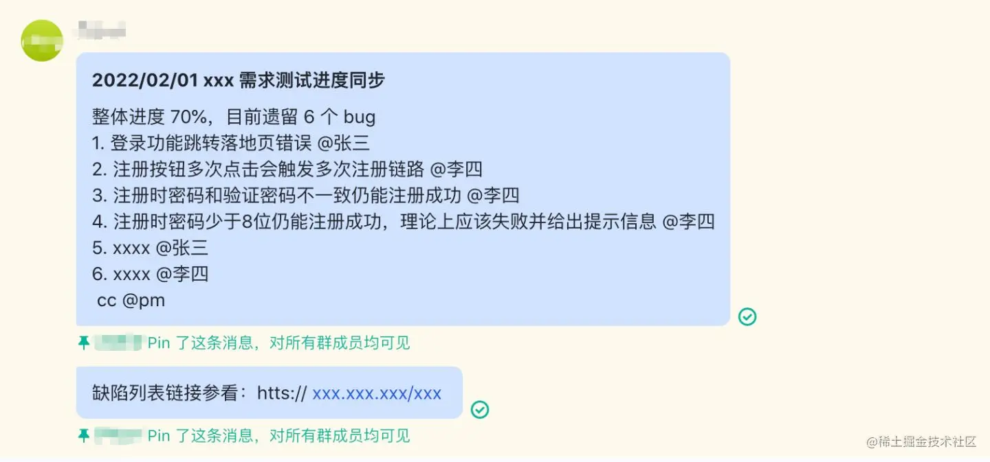 进度同步除了告知目前测试进度和延期风险外,最好还简单罗列一下目前遗留的问题并艾特到指定的研发同学,并周知 pm,然后附上缺陷列表链接,把整条消息 Pin 住。