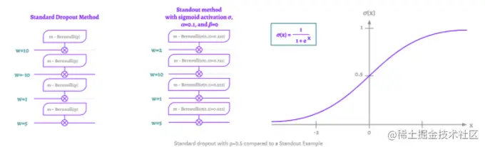 L. J. Ba和B. Frey介绍的Standout是一个标准的Dropout方法,基于一个Bernoulli mask(这是根据它们遵循的分布来命名这些mask,这样会更简单)。不同点在于神经元被遗漏的概率 p 在这一层中并不恒定。根据权重的值,它是自适应的。