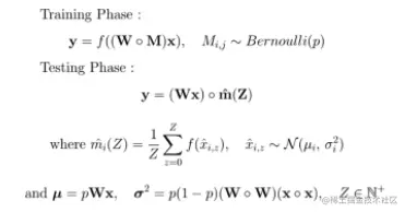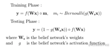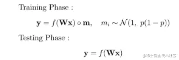 数学上的表示如上所示,有一个高斯mask的乘法(例如以1为中心的伯努利定律的标准差p(1-p))。通过在每次迭代中保持所有的神经元都是活跃的,从而随机地对其预测能力进行加权,从而模拟了dropout。这种方法的另一个实际优势集中在测试阶段,与没有dropout的模型相比,不需要进行任何修改。