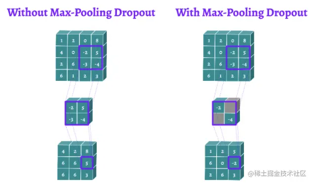Max-Pooling Dropout是H. Wu和X. Gu提出的一种用于CNNs的Dropout方法。它在执行池化操作之前,直接将伯努利mask应用到最大池化层的内核上。直观地说,这允许对具有高激活的pooling结果最小化。这是一个限制某些神经元的高预测能力的很好的观点。在测试阶段,你可以根据出现的概率来确定前面方法的权重。