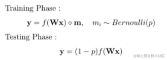 数学上表示如上所示,每个神经元丢弃概率遵循概率为 p 的伯努利分布,所以用一个 mask 对神经元向量进行了一个元素级操作,其中每个元素都是遵循伯努利分布的随机变量。