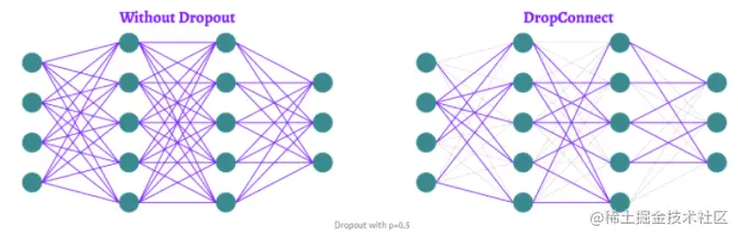 L. Wan等人介绍的DropConnect没有直接在神经元上应用dropout,而是应用在连接这些神经元的权重和偏置上。