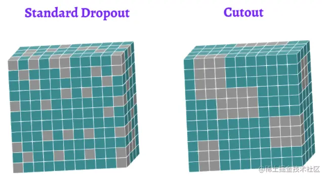 T. DeVries和G. W. Taylor提出的Cutout方法选择的是另一个做法,在不同区域中应用伯努利 mask,如下所示: