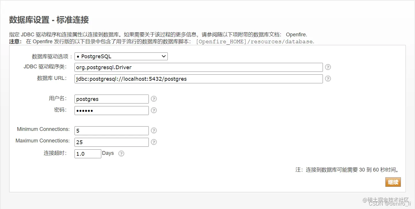 然后在 openfire 中设置刚才执行脚本的数据库: