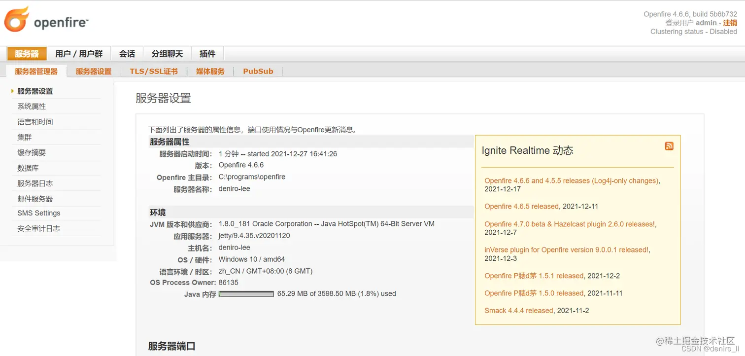 然后使用刚才设置的管理员账号与密码,即可登录 openfire: