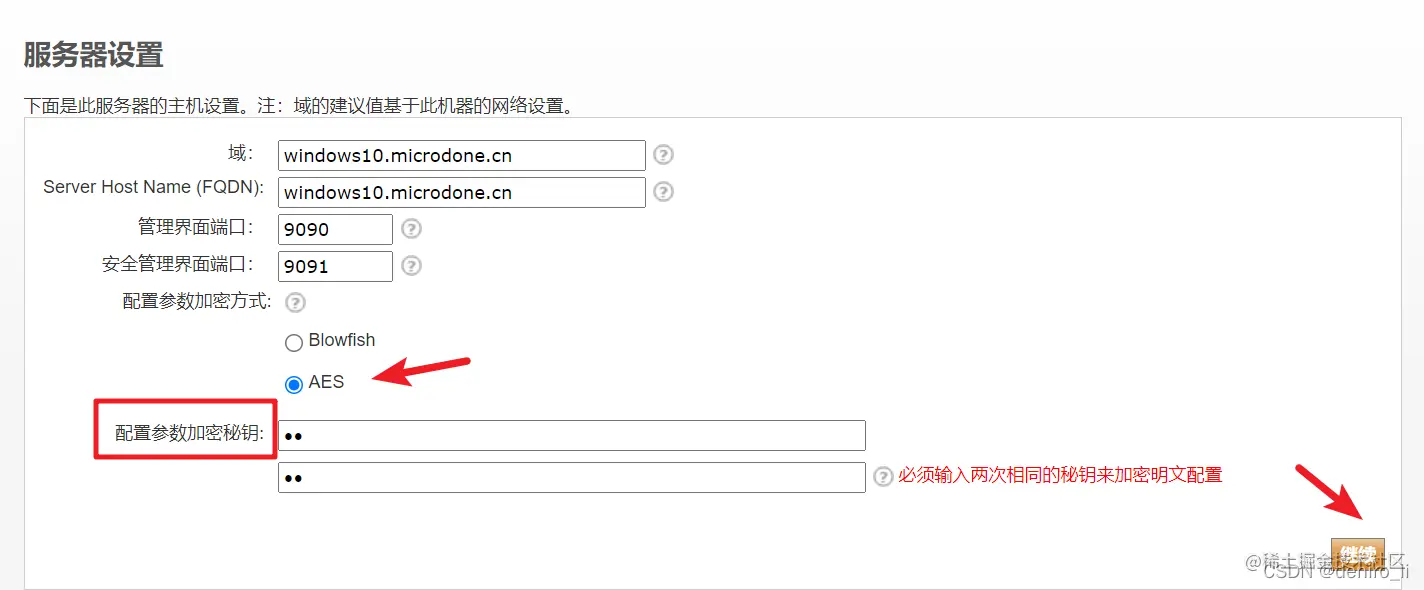接着设置服务器访问域与端口号(这里采用默认值),并配置参数加密方式为 AES 与加密的密钥。两次输入的密钥必须相同: