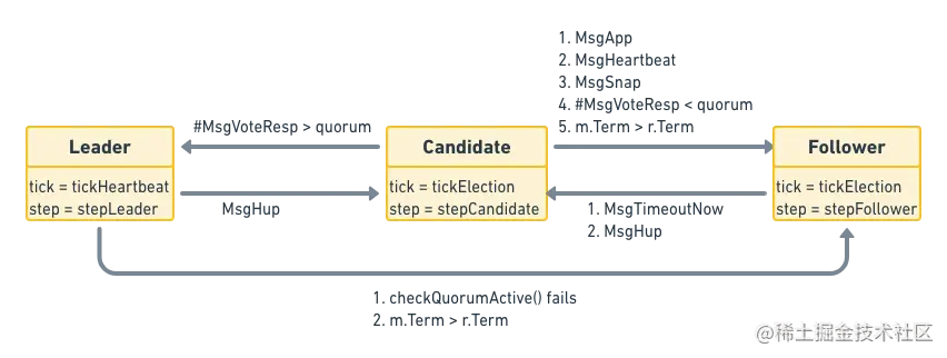 Term是不是比自己的大,以及接受到的日志信息是不是比自己的要新,从而决定是否投票。这个逻辑我们还是可以从Step函数中找到: